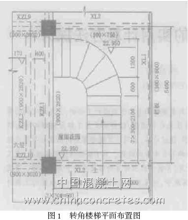 某框支剪力墻結構,地下兩層,1~5 層為商場, 6~30 層為住宅,總高度為100. 10m(閣樓除外) ,5 層高位轉換,轉換層高度為2. 22m。為了給住戶提供一個美好的生活空間,根據業主的要求,需要設6 層到5 層屋面花園的樓梯,根據場地情況,只能采用轉角樓梯,如圖1 所示。