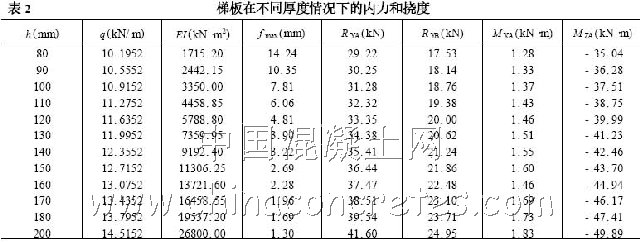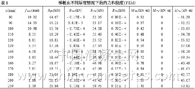 由式(1) ~式(6) ,可知不同梯板厚度的內力和變形(見表2) 。