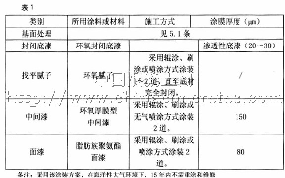 對于新建的或腐蝕尚不嚴重的橋墩砼,筆者推薦的防腐涂裝方案見表1 。