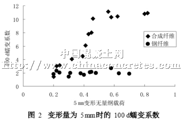 蠕變性直接影響到噴射混凝土的結構及橫穿裂縫的纖維。噴射混凝土的應變相對較小,但當纖維橫穿裂縫時其應變會很大。當混凝土產生裂縫以后,其抗拉強度迅速減弱,但如果纖維沒有被拉出,則纖維會繼續承受拉力。根據纖維種類及混合比,纖維噴射混凝土的變形承受能力為不含纖維的混凝土的數倍。一般說來,粗合成纖維的抗變形能力優于鋼纖維(見圖2) 。