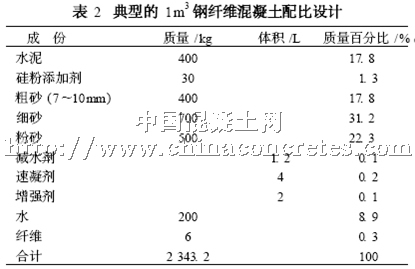 早期的鋼纖維混凝土配比設計[ 9 ]見表1。表1中的配比可以用來作為初始試驗值,要想得到最好效果的配比需要咨詢專家,并進行正交試驗設計。