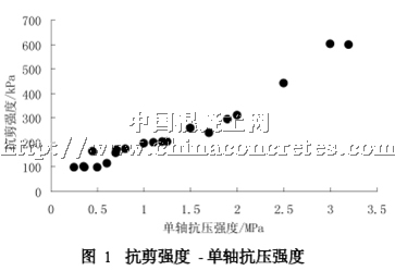 根據抗剪強度試驗方法不同,產生的抗剪強度也不同,因為抗剪強度與圍壓有關。如果與拉應力正交的圍壓降低,抗剪強度迅速下降。反之,增加圍壓可導致抗剪強度迅速上升。所以,在使用噴射混凝土抗剪強度時,必須得到其測試方法。否則,提供的數據可能導致誤解。圖1顯示典型的抗壓強度- 抗剪強度曲線。必須指出,噴射混凝土早期的抗剪強度無法估計。