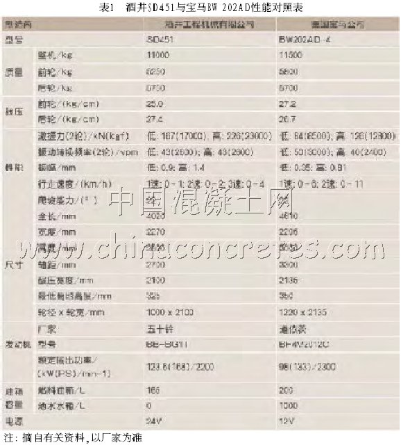 酒井SD451與寶馬BW202AD性能對照見表1