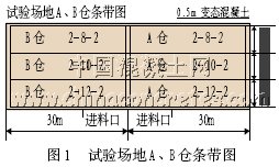 A、B倉面積均為11.5m×30m,每個倉面分3條碾壓條帶,每個條帶面積3.5m×29m,四周邊為0.5m的變態混凝土,3條碾壓條帶分別進行不同碾壓遍數的試驗; 第一條帶為2-8-2,即先靜碾壓2遍,振動碾壓8遍,后靜碾壓2遍; 第二條帶為2-10-2,即是先靜碾壓2遍,振動碾壓10遍,后靜碾壓2遍; 第三條帶為2-12-2,即是先靜碾壓2遍,振動碾壓12遍,后靜碾壓2遍。(試驗場地A、B倉條帶圖,圖1所示)