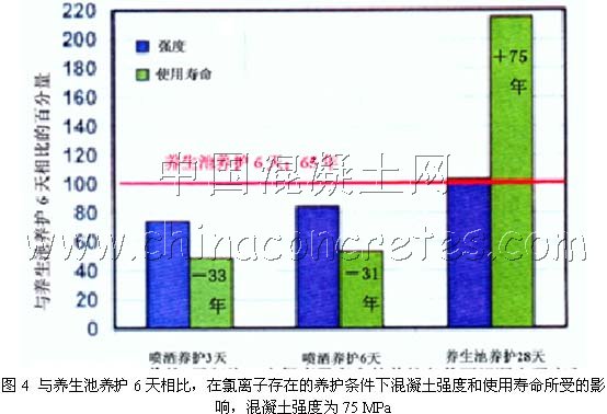 作為材料,水泥基材料與木材、塑料、陶瓷、磚瓦等最大的不同,在于使用過程中若能得到良好的養護,其強度可以成倍增長。因此國外稱之為活性材料(Living material)。正因為如此若欲獲得良好性能,對水泥基材料就應該象呵護嬰兒一樣的加強養護,不同的養護條件,性能將有顯著差異。為此Bentur[2]進行了很好的總結,其結果如圖3、圖4所示。共有四種養護條件:a.池中養護6天;b.噴灑養護3天;c. 噴灑養護6天;d. 池中養護28天;e.空氣中養護。圖中蘭色示出不同養護條件下強度的對比,可以看出池中養護28天強度最大,而噴灑養護的強度降低10~20%。但從耐久性而言,可以看出,28天水中養護可以“延年益壽”,否則壽命將縮短30~60%。 這是因為加強水中養護后,表面層得到很好的保護,使其在有水的條件下繼續水化,水化產物填充孔隙之后,密實度大大增加,從而使CO2和氯離子的滲透能力顯著降低,這對保護鋼筋是特別有利的。