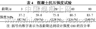按照試驗室提供的配合比進行2 次試生產,每次生產2m3 , 分別成型各齡期3 組150mm 標準試件, 取其平均值。試驗結果如表4 所示。