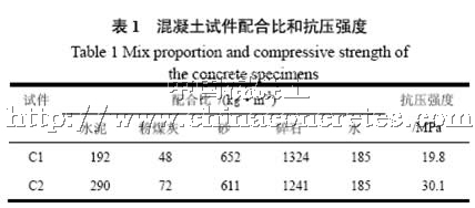 1用南京龍潭水泥廠生產的P·O 32.5級水泥,南京熱電廠的Ⅱ級粉煤灰,細度模數為2.5的河砂,最大粒徑10 mm的石灰巖碎石及自來水按表1所示配合比配制混凝土,成型成內、外直徑分別為30 mm 和110 mm的圓筒形試件,每組試樣成型六個,其中兩個用于滲透試驗,三個用于強度測定,另一個備用。試件在混凝土標準養護室養護28 d后,用切割機將試件兩頭截去,得到高度為110 mm的試件。取其中三個試件測定混凝土試件抗壓強度,結果見表1。