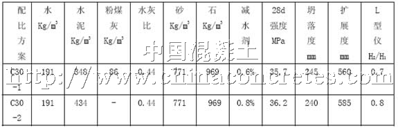 北京市房山區琉璃河水泥廠生產的42.5普通硅酸鹽水泥;粉煤灰:Ⅰ級粉煤灰,0.045篩余量5.6%,燒失量1.98%;砂:河砂,按JGJ52-92檢測細度模數為2.57,0.315篩余量22%,含泥量1.5%。石:按JGJ53-92檢測為5~20連續級配,含泥量0.9%。高效減水劑:聚羧酸系,減水率25%-35%。