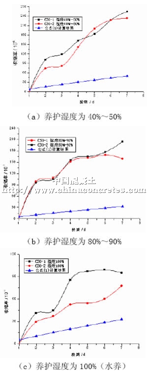 由圖4可知,在相同的濕度條件下,摻20%粉煤灰的SCC試件的7d收縮均比不摻粉煤灰的SCC試件的收縮小,降低幅度達到20%左右,證明在相同的濕度條件下摻加粉煤灰可以有效減小SCC的收縮。本文采用我國《混凝土收縮與徐變的試驗研究》專題協作組推薦的收縮公式[6](1)來計算SCC的收縮。
