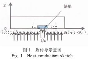 當有一個均勻的熱流從復合材料的內部向外流動時, 有缺陷區域處的表面比正常區域表面的溫度低( 熱傳導示意如圖1) , 所以采用紅外成像技術, 從存在缺陷的區域可獲得較低溫度的熱像圖。根據公式( 1) 和上述邊界條件就可以解出工件表面各點的溫度值[5]。