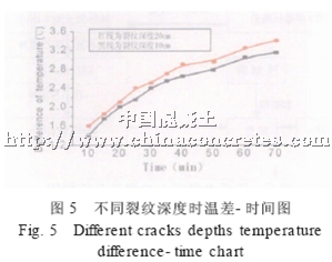 筆者對電阻率較高, 但裂紋深度不同的碳纖維混凝土試樣進行了紅外檢測。對于碳纖維含量占水泥重量的0.5%, 配比為水泥: 沙: 水=1: 25: 0.6 碳纖維水泥膠沙試樣, 裂紋深度分別為20mm、10mm, 切口寬度均為0.1mm 的大電阻試樣, 不同裂紋深度情況下, 板中心線與邊緣間表面最高溫差隨通電時間的變化見圖5。從圖中可見即使對大電阻試樣, 其裂紋深度的影響也是可見的, 同時也進一步為用紅外熱像檢測提供了實驗依據。