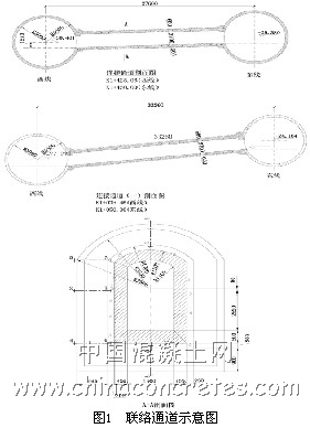 為滿足功能需要,在距兩圓隧道端部各1/3處設立兩個聯絡通道,均位于黃浦江底,位于浦西岸邊的為聯絡通道1、浦東岸邊的為聯絡通道2。兩通道相距約400m,具體參數見表1。聯絡通道與東、西線隧道接近正交連接,斷面為圓拱形,凈高2.70m,凈寬1.40m,凈截面積3.67m2,結構為單層鋼筋混凝土,厚度為400mm。在聯絡通道與隧道連接處襯砌較厚,呈喇叭口狀,開挖輪廓高5.30m,寬3.80m,開挖面積為19.37m2,如圖1所示。
