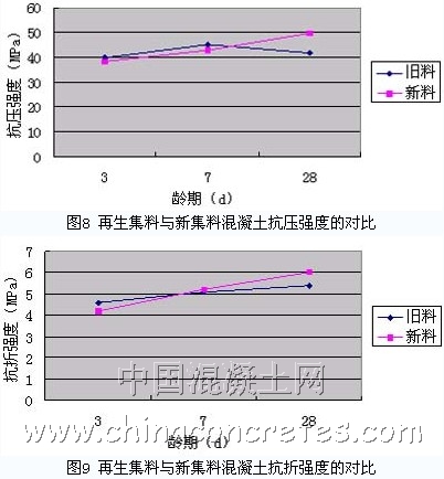 根據我們的研究表明(如表2與圖8和圖9所示),再生集料水泥混凝土能基本滿足路面混凝土要求,并具有以下特點: