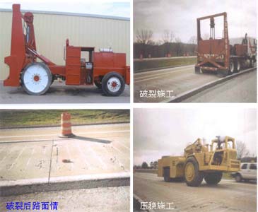 國內外現有的破碎工藝主要包括RoadMiner開路王系列破碎工藝、MHB型多頭重錘破碎工藝RMI共振型破碎工藝、沖擊壓穩(wěn)工藝、門板式震裂壓穩(wěn)工藝、沖擊鎬鑿碎壓穩(wěn)工藝等。我們在研究過程中,采用了MHB型多頭重錘破碎工藝(如圖-3)、門板式震裂壓穩(wěn)工藝(如圖-4)、沖擊鎬鑿碎壓穩(wěn)工藝等。同時,對典型路段進行使用效果評估。主要評價內容有:路面使用性能變化規(guī)律,反射裂縫率隨時間的變化,防止反射裂縫措施的有效性等。項目研究在重慶、湖北、廣東取得了良好的效果。