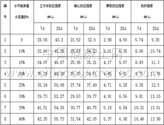對不同摻量的水性環氧樹脂鋼纖維混凝土的立方體抗壓強度、軸心抗壓強度、劈裂抗拉強度、抗折強度進行了測試,并與普通的鋼纖維混凝土進行了比較,實驗結果見下表: