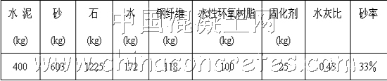 總的來說,番禺大石大橋橋面鋪裝層的損壞,是由于荷載作用下的應力超過材料的抗拉強度所致。因此,為了改善橋面的使用功能,延長橋面鋪裝層的使用壽命,同時根據室內試驗結果(水性環氧樹脂摻入SFRC后,混凝土的劈裂抗拉強度、抗折強度有較大的提高),番禺大石大橋橋面鋪裝層破損部位擬采用水性環氧樹脂增強鋼纖維混凝土。所用加鋪材料配合比為: