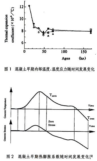 溫度應(yīng)力可表達(dá)成溫差、彈性模量以及混凝土熱膨脹系數(shù)的方程,而混凝土早期的熱膨脹系數(shù)往往與混凝土內(nèi)部濕度狀況相關(guān)。若要對(duì)大體積混凝土早期溫度應(yīng)力做出準(zhǔn)確的評(píng)估與預(yù)測(cè),必須研究混凝土早期熱膨脹系數(shù)及其隨時(shí)間發(fā)展變化情況。而早期混凝土屬于彈塑體,因此應(yīng)用線形變形測(cè)試手段監(jiān)測(cè)其熱膨脹系數(shù)存在一定困難。對(duì)此一些混凝土學(xué)者開展的具有針對(duì)性的研究。日本學(xué)者I.Shi-masaki等人應(yīng)用非接觸式高精度位移傳感器測(cè)定了混凝土早期的熱膨脹系數(shù)。其研究結(jié)果見圖2,可見混凝土早期熱膨脹系數(shù)并非定值,而是隨齡期逐漸發(fā)展變化,在澆筑后的幾個(gè)小時(shí)后,混凝土熱膨脹系數(shù)變化尤為明顯。以往的混凝土溫度應(yīng)力計(jì)算中經(jīng)常常將混凝土的熱膨脹系數(shù)視為定值處理,這種方法顯然與實(shí)際情況存在較大偏差。