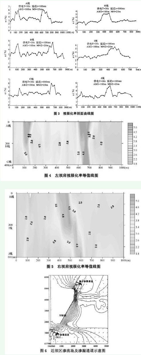 利用水位矢量場法和激發極化法準確的界定了左、右壩肩部位集中滲漏通道的位置。在左岸A線100~175m、B線100~150m范圍; A線600~700m、C線625~700m范圍有2處集中滲漏通道;右岸H線375~475m、J線550~625m范圍有1處集中滲漏通道。