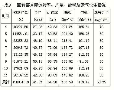 根據(jù)A化工企業(yè)年生產(chǎn)PVC規(guī)模所產(chǎn)生的電石渣量,我公司以電石渣100%替代石灰石,利用新型干法水泥生產(chǎn)工藝于2008年2月建成一條1600t/d水泥熟料生產(chǎn)線。 1 生產(chǎn)工藝流程及裝備選型 1.1工藝流程圖(圖1)。 圖1 工藝流程圖 1.2 主機(jī)設(shè)備配套選型(表1) 表1 主機(jī)設(shè)備選型 2 調(diào)試與試生產(chǎn)情況 生產(chǎn)線采用中央集散控"制DCS系統(tǒng)進(jìn)行調(diào)控,生產(chǎn)自動(dòng)化程度比較高。操控以中控為主,現(xiàn)場為輔。 2.1系統(tǒng)相關(guān)工藝參數(shù)(表2) 2.2 生料制備配比 通過多次試驗(yàn)摸索確定的生料組分見表3。 2.3 相關(guān)工藝指標(biāo) 經(jīng)連續(xù)幾個(gè)月的煅燒最終確定了生料入窯鈣、鐵、細(xì)度和三率值(表4)。 2.4 煙煤的工業(yè)分析(表5) 2.5 熟料化學(xué)成分(表6) 2.6 熟料性能指標(biāo)(表7) 2.7 回轉(zhuǎn)窯月度運(yùn)轉(zhuǎn)率、產(chǎn)量、能耗、廢氣排放含塵(表8) 3 試生產(chǎn)暴露的問題及改進(jìn)措施 (1)烘干破碎機(jī)堵料壓死問題的解決。在進(jìn)口濕料易堵料處,加裝空氣炮,烘干破上口增加2組打散器;改進(jìn)措施:出口干粉收集旋風(fēng)器下鎖風(fēng)裝置更換改進(jìn),保證氣路料路暢通。 (2)電石渣干粉入庫溫度很高,造成干粉庫均化卸料裝置損壞,出庫下料不穩(wěn),生料出磨及入窯質(zhì)量嚴(yán)重波動(dòng)。改進(jìn)措施:使用耐高溫材料,維修更換庫底沖氣裝置及放料電控闡板,使用管式螺旋秤。 (3)C1預(yù)熱器進(jìn)風(fēng)道、下錐體,C2預(yù)熱器下錐體,窯尾煙室及斜坡易堵料。改進(jìn)措施:在這些地方加裝空氣炮,強(qiáng)化人工捅料工作。嚴(yán)格控制電石渣Cl-含量,嚴(yán)格控制工況參數(shù),嚴(yán)格執(zhí)行操作程序。 (4)管道分解爐下錐體三次風(fēng)進(jìn)風(fēng)口不是按蝸殼形狀設(shè)計(jì)制作安裝,在高溫和高速料流沖刷下,損壞漏風(fēng)嚴(yán)重,影響煅燒。改進(jìn)措施:改進(jìn)設(shè)計(jì),按要求現(xiàn)場進(jìn)行制作整改。 (5)由于對(duì)干電石渣的容重沒有足夠的了解,系統(tǒng)按普通生料容重配置輸送設(shè)備,造成其能力嚴(yán)重不足。改進(jìn)措施:對(duì)相關(guān)提升機(jī)、空氣斜槽、拉運(yùn)機(jī)進(jìn)行更換。 (6)由于烘干破碎機(jī)直接采用窯尾系統(tǒng)用風(fēng)和熱源,窯尾風(fēng)路系統(tǒng)比較復(fù)雜,一級(jí)、二級(jí)預(yù)熱器料流分離率不是很高,造成窯內(nèi)煅燒來料不穩(wěn)。改進(jìn)措施:將C1、C2預(yù)熱器內(nèi)筒加長1 m。 (7)由于電石渣生產(chǎn)熟料工藝相對(duì)比較復(fù)雜,操作參數(shù)需適時(shí)摸索調(diào)整,如各點(diǎn)控制溫度、工況負(fù)壓、負(fù)荷,入窯生料相關(guān)指標(biāo)、熟料檢測指標(biāo)修定等等。 總的來說,各主、輔機(jī)在試生產(chǎn)運(yùn)行中不斷出現(xiàn)一些故障,需急時(shí)停機(jī)進(jìn)行維修和改進(jìn),造成生產(chǎn)的中斷,所以整體運(yùn)轉(zhuǎn)率不是很高。 4 遺留的問題 (1)由于C1預(yù)熱器采用單臺(tái)大尺寸形式設(shè)計(jì)制作,氣、料分離效率有限,造成系統(tǒng)回料量較大,影響烘干破碎機(jī)烘干效率和窯尾收塵效果。 (2)由于烘干破碎機(jī)系統(tǒng)貫穿于窯尾系統(tǒng)之中,在一定程度上形成相互制約,相互影響,停窯時(shí)無法進(jìn)行電石渣烘干,烘干破碎機(jī)出現(xiàn)故障時(shí)回轉(zhuǎn)窯無法生產(chǎn)。 (3)由于電石渣由A企業(yè)提供,生產(chǎn)過程中常常出現(xiàn)矛盾,A企業(yè)生產(chǎn)正常時(shí),我方生產(chǎn)有時(shí)不正常,我方生產(chǎn)正常時(shí),A企業(yè)生產(chǎn)有時(shí)不正常或限產(chǎn)。 (4)在生產(chǎn)過程中,由于對(duì)電石渣的相關(guān)特征以及對(duì)整個(gè)生產(chǎn)工藝的認(rèn)識(shí)了解還不夠完全,重點(diǎn)是煅燒過程控制需要進(jìn)行更進(jìn)一步的探索,以確保獲得更優(yōu)質(zhì)、多性能用途的熟料產(chǎn)品。
