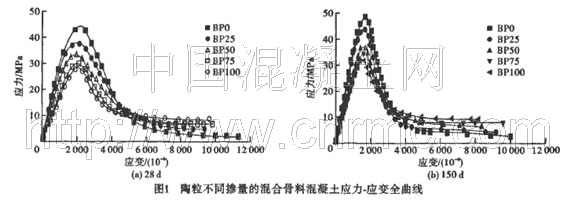 對每組3個試件的曲線取平均值得到5組陶粒與碎石不同體積比混合配制的混凝土應力-應變全曲線,圖1為分別養護至28 d和150d時的應力-應變全曲線最終匯總結果。