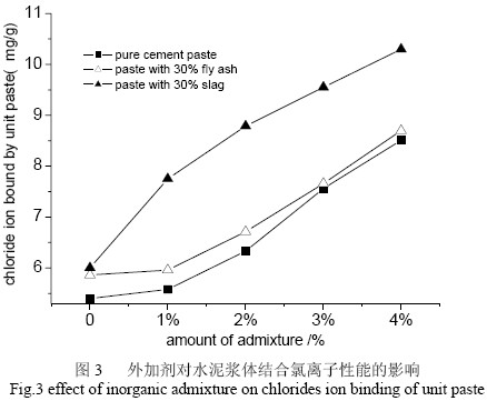 值得一提的是,摻用少量本文的外加劑就能顯著提高單位漿體結合氯離子的能力,可能原因是,該外加劑摻入水泥漿體中后,促進了漿體對氯離子的化學結合能力,有利于氯鋁酸鹽的形成,其機理正在進一步驗證中。另外,礦渣與外加劑復合摻入后,漿體結合氯離子性能進一步增加,表明兩者存在疊加作用效應。但就結合氯離子而言,該外加劑與粉煤灰之間無明顯疊加效應。