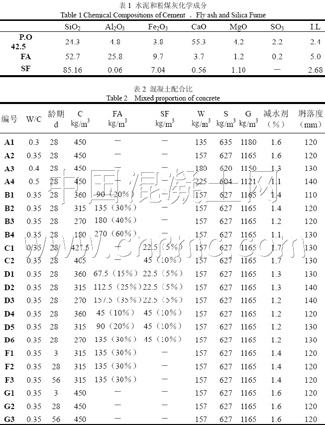 目前評價Cl-在混凝土中滲透的方法很多,包括自然遷移的方法、電遷移的方法等等,其中ASTM C 1202 (AASHTOT277)由于被定為標準,也就成為具有權威性的方法,并被廣泛應用。但是,由于各種方法都有其局限性,所以這兩種標準方法的使用范圍應與在與長期氯化物滲透試驗方法(如AASHTOT 259)之間建立起相關性的混凝土中,并要謹慎使用試驗結果,特別是用于質量控制和驗收時,應定性地使用表3 中的幾個級別,也就是說,用ASTM C 1202(AASHTOT277)標準所測的混凝土6h庫侖電量作為各種不同混凝土之間的定性比較的效果要好于定量比較的效果[2,3]。之所以推薦定性而不是定量評價,原因之一是影響混凝土導電量的因素與影響其Cl-滲透性的因素并不完全相同,有時差別還很大[2]。本文通過試驗研究了水灰比、粉煤灰、硅灰和齡期等因素對混凝土抗氯離子滲透性能的影響,以期定性的配制出具有高抗氯離子滲透性能的高性能混凝土。