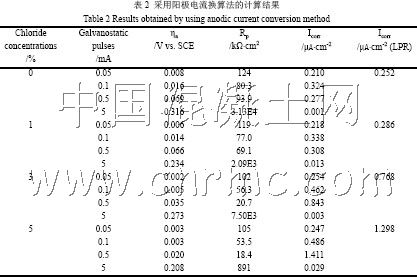 表2 所示為運用陽極電流換算法得到的各試樣在不同擾動信號強度下的計算結果。通過與線性極化測試結果對比可以發現:當外加電流較低時(如0.05mA),各試樣所得的計算結果均偏低,尤其是Cl-含量為3%及5%試樣的偏離度已將近一個數量級。這是由于采用該法計算時忽略了陰極電流的影響,從而低估了外測電流值。當脈沖電流為0.5mA 時所得Icorr值則較為理想。然而,當施加的脈沖電流達到5mA 時,通過陽極電流換算法得到的腐蝕速率值均比實際值低一至兩個數量級。這可能是因為在大陽極電流情況下鋼筋極化進入強極化區,此時陽極Tafel 斜率ba 仍沿用假定的0.07 已不合適,宜重新對ba 的取值進行校正,如另行采用基準試樣對所測的Tafel 極化曲線進行直線外推法擬合,從而得到較合理的ba 值。