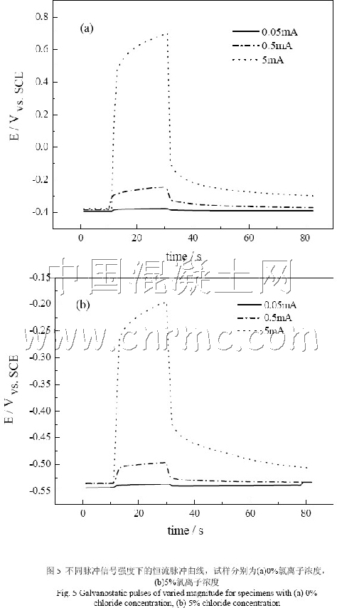 恒流脈沖仍采用線性極化測試的三電極體系。陽極電流由一個可調節恒流發生器提供,電流通過不銹鋼筒輔助電極流向鋼筋網。鋼筋電位相對參比電極的變化由一個帶數據記錄功能的儀表監測(Fluke 189,其檢測精度為0.01mV,1s 讀取并記錄10 個數據)。擾動脈沖電流大小分別為0.05mA、0.1mA、0.5mA 及5mA,持續時間20s。