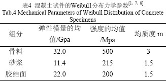 基于混凝土細(xì)觀力學(xué),利用RFPA 數(shù)值模擬軟件,把混凝土視為由砂漿基質(zhì)骨料以及兩相之間界面組成的三相復(fù)合材料。為了考慮各組成相的非均勻性,各組成相的材料性質(zhì)按照Weibull 分布來賦值。首先,用一個(gè)Weibull 分布來表達(dá)整個(gè)試樣的材料性質(zhì)分布, 這相當(dāng)于生成砂漿基質(zhì)試樣,該試樣的力學(xué)性質(zhì)要與真實(shí)的硬化水泥砂漿體的參數(shù)基本一致。然后,在該基質(zhì)試樣中添加骨料顆粒,程序會(huì)自動(dòng)搜索骨料的邊界并把邊界上的單元賦上相應(yīng)的力學(xué)參數(shù)。骨料的參數(shù)參照巖石的力學(xué)性質(zhì)參數(shù)選取,對(duì)于普通混凝土,骨料的強(qiáng)度相對(duì)于砂漿基質(zhì)的強(qiáng)度較高,并且其均值度也較高。砂漿的參數(shù)參照依據(jù)混凝土配比制成的砂漿試件的干濕循環(huán)試驗(yàn)所得到的結(jié)果進(jìn)行賦值。界面的參數(shù)沒有現(xiàn)成的試驗(yàn)依據(jù),參數(shù)取值參考文獻(xiàn)[1]。