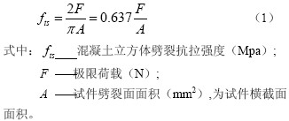 混凝土立方體劈裂抗拉強(qiáng)度按下式計(jì)算: