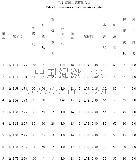 本文針對用于北方寒冷地區易受環境或化冰鹽中氯離子侵蝕的橋墩或塊體混凝土,根據配制試驗測試結果,分析在不同水膠比混凝土中摻入不同組分的礦渣與粉煤灰時混凝土的強度、抗氯鹽侵蝕及抗裂性能相關參數的變化情況[3],為工程實際應用提供參考。