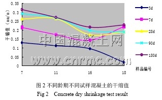 再次是摻合料對混凝土干縮性能的影響。對試樣7、11、16、18 四組進行了混凝土干縮試驗, 結果圖2 所示。從不同齡期干縮試驗結果看,同時摻礦渣與粉煤灰混凝土的干縮值小于只摻礦渣混凝土的干縮值,且隨水泥用量的增加而增大。