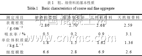 從調配好的城市熔渣粗骨料與細骨料中抽出試料,根據材料試驗有關規范測出其基本物理性質,及粗、細骨料的表觀密度、吸水率、單位容積質量以及細度模數。城市熔渣粗、細骨料以及天然骨料的材料基本物理性質如下表1。