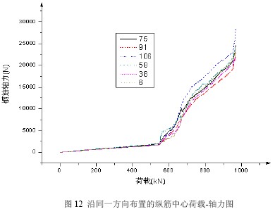 由縱向鋼筋荷載-軸力圖可知其曲線分為兩個階段:從開始到極限荷載的40%時承臺開裂,曲線比較平緩,鋼筋軸力很小,約為極限荷載時鋼筋軸力的5%,說明加荷初期,承臺的變形很小,外荷載主要由混凝土承擔。裂縫出現以后,鋼筋承受拉力的作用增強,鋼筋應力增長速度明顯大于荷載增長的速度。