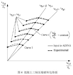 ADINA 中使用了三維受拉破壞包絡線、二維破壞包絡線、三軸壓縮破壞包絡面。其中,二維破壞包絡線、三軸壓縮破壞包絡面曲線如圖3、圖4 所示。