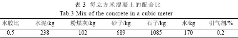 表3 為混凝土每立方米的配合比,粉煤灰取代水泥30%,摻加0.2%的高效引氣劑,混凝土中的含氣量5.5%,不摻加引氣劑的該配比混凝土的含氣量為1.9%。