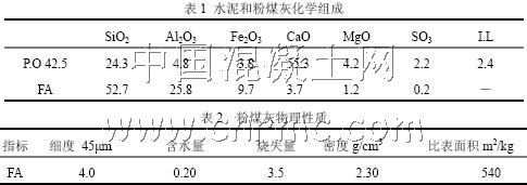 水泥(簡稱C):湖南湘鄉水泥股份有限公司生產,強度等級為42.5 普通硅酸鹽水泥;粉煤灰(簡稱FA):湖南湘潭電廠生產的風選I 級粉煤灰,其物理性質見表2;硅灰(簡稱SF):西北鐵合金廠生產;砂:湖南湘江河砂,中砂,細度模數為2.7,II 區級配合格;外加劑:湘潭市潭建減水劑廠,TJ 系列高效減水劑;水:蒸餾水。