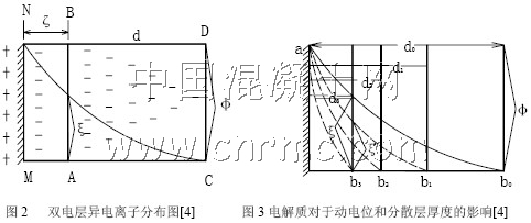 對氯離子的物理吸附主要是通過雙電層來完成的[3]。固體表面帶相反電荷的離子并不是完全正確的排列在一個面上,而是有一定的濃度分布,其電荷分布如圖2 所示。雙電層分為兩部分:一部分緊靠固體表面的不流動層,稱為緊密層,其中包含了被吸附的離子和部分過剩的異電離子,其厚度δ 約為幾個水分子大小:另一部分從AB 到CD,稱為漫散雙電層,在這個層中過剩的異電離子逐漸減少為零,這一層是可流動的。雙電層存在電位差ζ,對異電離子有影響。ζ 絕對值的大小與異電離子在雙電層中的分布有關。異電離子分布在緊密層越多,則ζ 電位絕對值越小,如果在外界環境加入電解質,離子濃度增大,電解質中與異電離子符號相同的離子會把異電離子擠入緊密層,這樣,緊密層的異電離子就會增加,而漫散層內過剩的異電離子則會減少,漫散層變薄,ζ 電位降低。如圖3 所示。可以看出,漫散層被壓縮后,總電位Φ 仍保持不便,而ζ 電位隨之降低,雙電層的厚度d 也隨之降低。