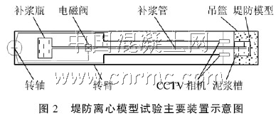 將制作好的堤防模型,安放在離心機吊籃內。在模型的槽孔內灌入指定密度的漿液(并用乳膠薄膜 袋盛裝)。開機逐步加速至100 g 。在100g 的離心加速度下,穩定運轉10 min。試驗過程中,通過兩個監視器觀測液面高度和裂縫的產生情況,同時進行錄相。試驗結束后用數碼相機拍照。