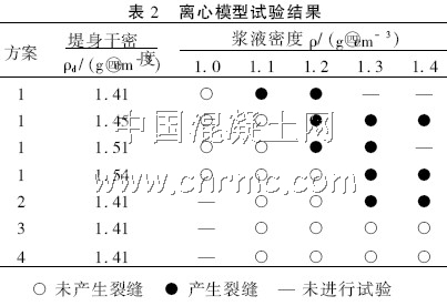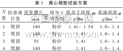 1)堤身土體干密度和槽孔內泥漿密度堤身和基礎采用粉沙。槽孔長度固定為140mm(相當于原型14m,下同)。根據文[2],出現裂縫堤段的干密度ρd 在1. 4~ 1. 55 g/ cm3 之間。因而在離心模型試驗中,配制了ρd 分別為1. 41,1.45, 1.51,1.54 g/ cm3 的4種堤防模型;分別采用了5種密度的漿液。