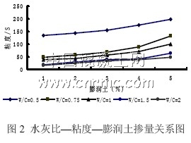 研究表明:膨潤土水泥漿液的性能主要取決于水泥、膨潤土、水的用量。在水泥漿液中加入膨潤土,一般具有如下變化規(guī)律:漿液粘度隨水灰比的增大而降低,相同水灰比的漿液,膨潤土用量越多粘度越大(見圖2),凝結(jié)時(shí)間越長,結(jié)石率越高,但強(qiáng)度降低;漿液中干料越多,或者在不改變水與干料配比的情況下,增加膨潤土用量可提高漿液的穩(wěn)定性,使用時(shí)可根據(jù)巖土物理力學(xué)性質(zhì)、含水量以及工程處理的具體要求由試驗(yàn)確定。