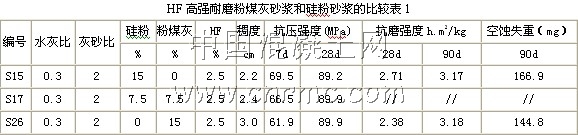表1中列出了幾種砂漿的試驗結果,比較表中的三個配合比,可以看出,摻15%硅粉的砂漿,與摻7.5%硅粉又摻7.5%粉煤灰的砂漿以及不摻硅粉全摻15%粉煤灰的砂漿,三種砂漿除7天強度隨硅粉摻量的增加有所增加外,28天強度并沒有多大的差異,說明在HF外加劑的作用下,摻優質粉煤灰即可達到摻硅粉一樣的強度,換句話說,HF粉煤灰砂漿可以達到硅粉砂漿的強度。對比抗磨強度和抗空蝕性能,HF砂漿的抗空蝕性能還稍優于硅粉砂漿,HF粉煤灰砂漿28天的抗磨強度稍低,而90天的抗磨強度又高于硅粉砂漿的抗磨強度。