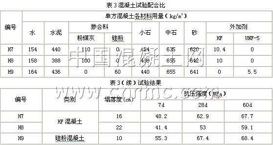 4.1.2外加劑及骨料:普通混凝土使用CR型緩凝減水劑和CS型引氣劑,硅粉混凝土使用UNF-5高效減水劑,HF混凝土使用HF外加劑。骨料(略)。