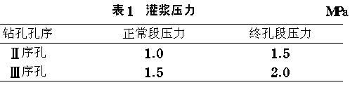 (3)灌漿。①灌漿材料。水泥采用P32.5水泥,強度等級以滿足設計要求為準,細度滿足規范要求。水泥符合規定的質量標準,不使用受潮結塊的水泥。水泥不應存放過久,儲期超過3個月的水泥不得使用。化學材料符合設計要求。②制漿。采用高速攪拌機制漿液,攪拌時間不小于30s,必須攪拌均勻并測定漿液比重,從制備至用完宜小于4h。制漿漿液水灰比采用1∶1或0.8∶1。注漿管采用φ19.05mm鐵管或同管徑的PPR管。③輸漿。設備器具為儲漿桶、3SNS泵、清洗泵、水動力泵、手槍泵、手壓泵等。④灌漿方法。Ⅰ序孔1次性成孔后下兩根注漿管,卡塞位置在粘土墻與砂卵石層接觸部位,卡塞采用膜袋施工技術;1根注漿管下至距孔底20~50cm處,另1根注漿管下至膜袋以下10~20cm。灌漿孔Ⅲ施工,灌漿時先灌上管,再灌底管。同一次序孔也可以循環交叉灌注。⑤灌漿壓力見表1。⑥漿液水灰比采用1∶1,特殊情況下可采用0.8∶1;灌漿過程中應使灌漿壓力盡快達到設計要求。通常情況下,主要添加劑采用專配的化學控制液,摻量為水泥的6%~7%。若遇特殊情況,摻量根據現場適當調整。⑦灌漿結束標準。當灌漿段灌漿壓力已達設計要求值,注入率不大于20L/min時,可結束該段灌漿,或當灌漿段灌漿壓力已達設計要求值,漿液灌入量超過設計量(1200L/m)后,即可結束該段灌漿。⑧特殊情況處理。灌漿注入量達400~500L后,注入率仍較大,而灌漿壓力仍未達到設計要求值,即加入化學控制液,直至灌漿壓力值達結束標準;灌漿過程中若遇到串、冒等現象,立即加入化學控制液灌注,至灌漿壓力達到設計壓力可結束該段灌漿。特殊情況下也可采取待凝或灌砂等手段;灌漿管安置深度,根據現場地質情況確定。