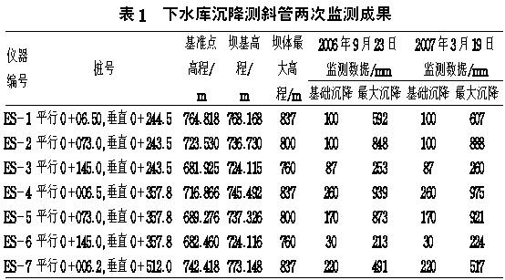 下水庫共埋設(shè)沉降測(cè)斜管7個(gè),其分布情況和監(jiān)測(cè)數(shù)據(jù)如表1。