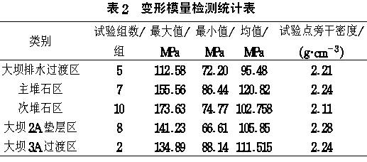下水庫壩體在上升過程中對(duì)各填筑區(qū)進(jìn)行了多次變形模量(淺層平板載荷)試驗(yàn),其檢測(cè)成果如表2。