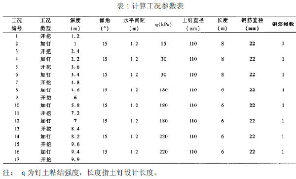 計算采用啟明星深基坑支護設計軟件進行。計算時考慮地面超載20kPa。施工工序為每次開挖深度1.2m 后加一次土釘,土釘距坑底0.2m。計算將每道施工步序作為一種獨立靜止狀態,按一種工況計算,計算工況參數詳見表1。