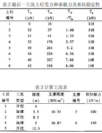 每種工況每排土釘均Tuj/Tjk>1.25,Tg/Tjk>1.25。其中最后一工況土釘承載力見表2