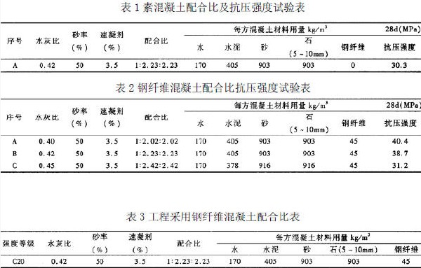 原素噴混凝土設計強度等級為C20,于現場進行了配合比及28d 抗壓強度試驗(見表1),鋼纖維混凝土配合比要考慮設計要求的抗壓、抗折等級,還要顧及施工方便。在常用的C20 泵送混凝土配合比基礎上,調整砂率,適當增加膠凝材料的總量,共試拌A、B、C 三組配合比試驗(見表2)。通過綜合比較試拌混凝土的抗壓、抗折強度、和易性、鋼纖維分布情況等,最終確定泵送鋼纖維混凝土配合比(見表3)。