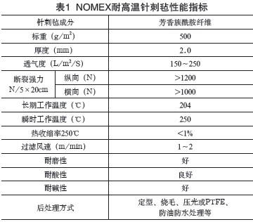 (1)濾袋的選擇:袋式除塵器是一種利用有機纖維或無機纖維過濾布將含塵氣體中的固體粉塵在濾袋的過濾、慣性碰撞、攔截、擴散、靜電、重力沉降等作用下分離出來的一種高效除塵設備,布袋的好壞直接關系到除塵系統的效率。精湛的縫制技術和選用合適優質的濾料,是保護該系統高效率的關鍵。國內濾料的發展與袋式除塵器的發展是同步的,瀝青攪拌設備除塵用濾料主要是NOMEX針刺氈濾料、芳綸針刺氈濾料等。其中NOMEX針刺氈濾料的性能指標見表1。